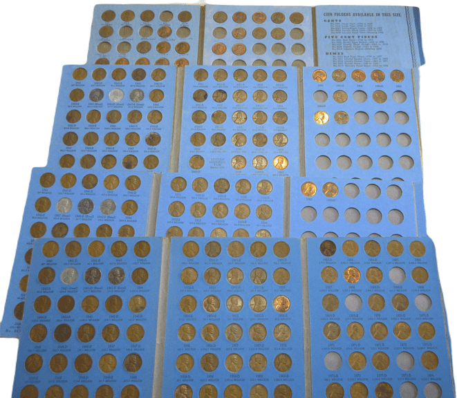 This auction item features an extensive collection of Lincoln Wheat and Memorial Cents meticulously organized in blue coin albums. The collection spans multiple decades, with each coin securely displayed in its designated slot. Ideal for collectors, this set offers an excellent opportunity to acquire a substantial range of historical U.S. CENT, showcasing various mint years and conditions. Don't miss the chance to enhance your collection with these beautifully preserved coins.