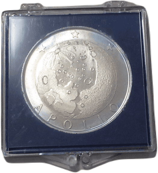 This auction offers a unique collectible coin commemorating the Apollo space program. The coin features a detailed design of the lunar surface and celestial elements, with Apollo inscribed prominently. It is encased in a protective display case, ensuring its preservation and showcasing its historical significance. A must-have for any coin collector or space enthusiast!