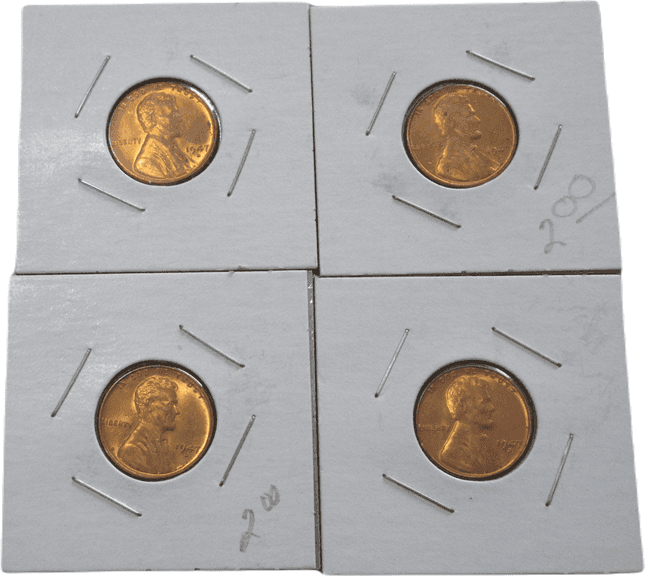 This auction features a collection of four vintage Lincoln Wheat Pennies, each dated 1957. These s are preserved in protective cardboard holders for optimal presentation and protection. Known for their historic value, these Lincoln Wheat Pennies make an excellent addition to any numismatic collection or a great start for budding enthusiasts. The s are in good condition, showcasing their iconic design and rich history. Don't miss the opportunity to own a piece of American age history.