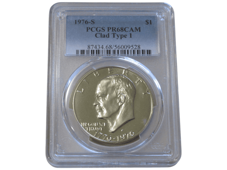 The 1976-S Eisenhower Silver Dollar, a product of the San Francisco Mint, boasts a limited mintage as part of the U.S. Bicentennial celebration series, with its Clad Type 1 variant making it a hallmark of mid-1970s numismatics. This particular piece is graded PCGS PR68CAM, a designation highlighting its exceptional cameo contrast and near-perfect surface preservation, offering a premium example for discerning collectors. As part of the only U.S. coinage series to feature dual dating, its obverse design by Chief Engraver Frank Gasparro and unique Bicentennial reverse by Dennis R. Williams, coupled with its special minting techniques, underscore its historical and visual allure. Within registry sets, the coin's high-grade proof status elevates its desirability, particularly for collectors aiming to complete an Eisenhower Dollar series collection. Its striking eye appeal and cameo finish ensure it stands out, solidifying its status as a staple for enthusiasts focused on the numismatic treasures of the 20th century.