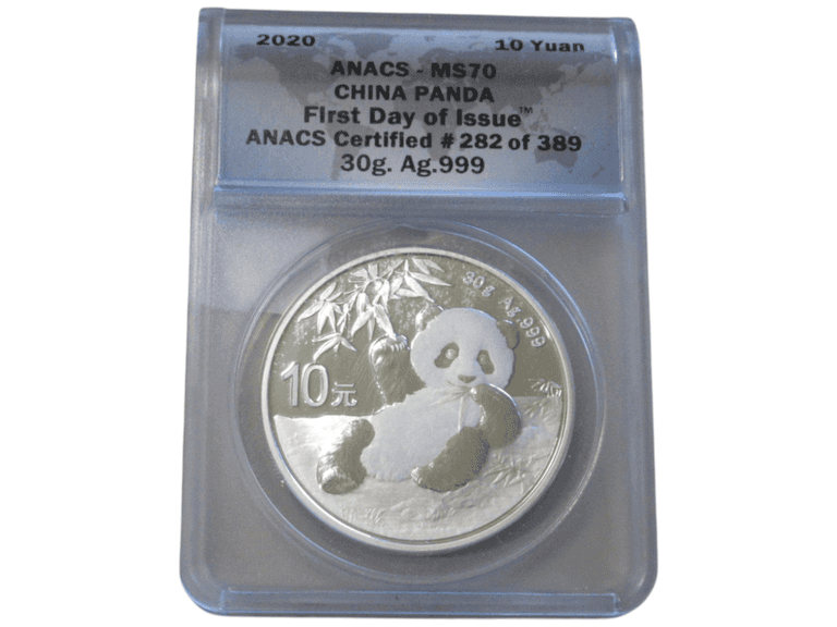 The 2020 China Panda 10 Yuan Silver Coin, graded ANACS MS70 as a First Day Issue, represents a pinnacle of modern numismatic excellence with its flawless Mint State condition. Composed of 99.9% pure silver and weighing 30 grams, this coin stands out for both its bullion value and its allure as a collector's item. Minted with meticulous craftsmanship by the China Mint, the Panda series is renowned for its annually changing designs, which significantly enhance its desirability among collectors. The MS70 grade, combined with the First Day Issue designation, commands a premium, making it a sought-after piece for both precious metal investors and numismatic enthusiasts alike.
