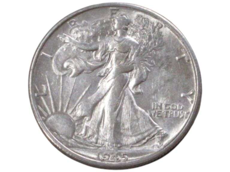 The 1945 Walking Liberty Half Dollar, struck at the Philadelphia Mint, boasts a mintage of 12,100,000, making it a common date within the series. Designed by Adolph Weinman, this coin features the iconic Liberty walking in a flowing gown, symbolizing freedom and progress, a design that has captivated collectors since its introduction in 1916. This About Uncirculated example exhibits strong luster and well-defined details, characteristic of the later years of production, where strike quality improved significantly compared to earlier issues. As a staple for type collectors and those completing sets, the 1945 Walking Liberty Half Dollar remains a popular choice, with its historical significance tied to the post-World War II era and the economic recovery that followed. Its availability in high-grade conditions makes it a desirable addition for both novice and seasoned collectors alike.
