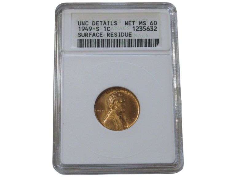 LOT 24 - 1949-S Lincoln Wheat Cent ANACS Graded UNC Details Surface Residue