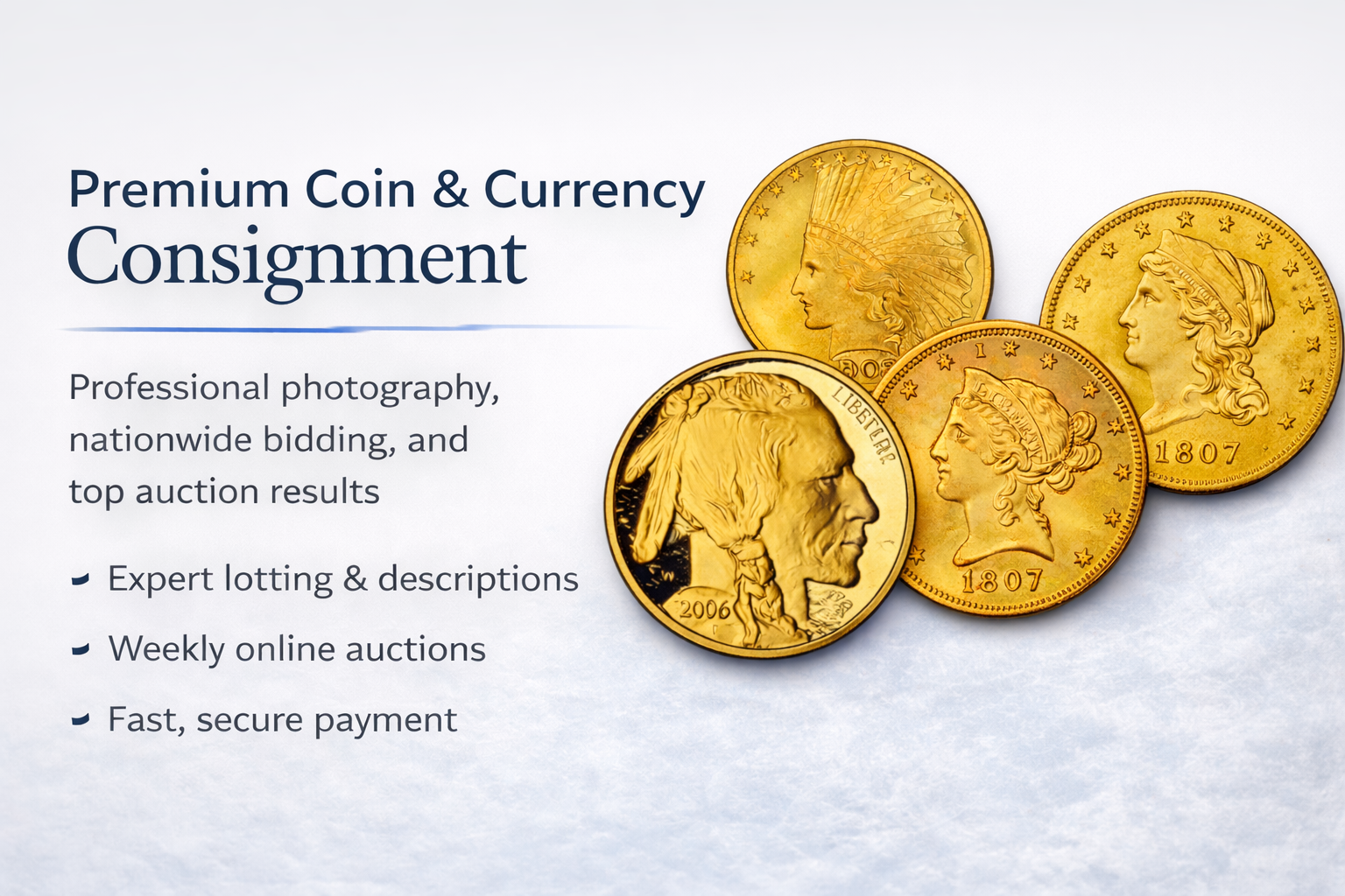 Welcome to our Coin Consignment Services page, where we specialize in helping clients sell rare coins, entire coin collections, and currency through professional online auctions. If you are looking to sell a coin collection, rare coins, or paper currency, our streamlined consignment process is designed to deliver strong results and maximum value.